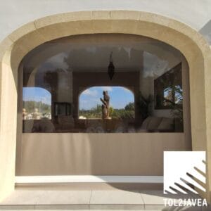 This is a free-fall vertical awning, ideal for sun protection and comfort in interior spaces with large windows. Its simple and functional design, combined with the versatility of the screen fabric, make it an excellent choice for any home. This type of awning adapts perfectly to large windows and irregular shapes, such as those shown in the image. It blocks harmful UV rays, preventing the interior from overheating and protecting furniture and objects from fading. The design is simple and functional, with straight lines and a vertical drop. Side guides ensure that the fabric slides smoothly and precisely. The awning fabric is a screen fabric, characterized by being translucent and allowing diffused light to pass through, while blocking UV rays and direct view from the outside. This suggests that the fabric is made of a high-quality technical material, such as PVC-coated polyester. The color of the tarpaulin is a beige or cream tone, which gives it a neutral and elegant look, blending well with different decorating styles.
